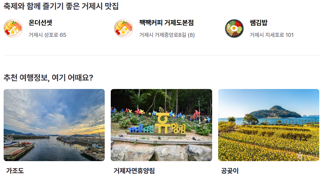 - 부대 프로그램: 축제에 먹거리가 빠지면 섭섭하죠! 지역 특산품 판매 부스에서는 거제의 신선한 특산물을 만나볼 수 있고요, 다양한 먹거리 판매 부스와 푸드트럭 에서 맛있는 음식도 즐길 수 있어요. 아기자기한 소품들을 구경하는 재미가 쏠쏠한 플리마켓 도 열린다고 하니, 지갑 단단히 붙들어 매셔야 할지도?!