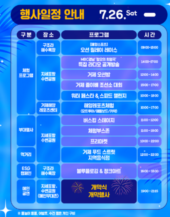 - 축제 장소: 경상남도 거제시 지세포항 수변공원 일원 (거제해양레포츠센터 주변)