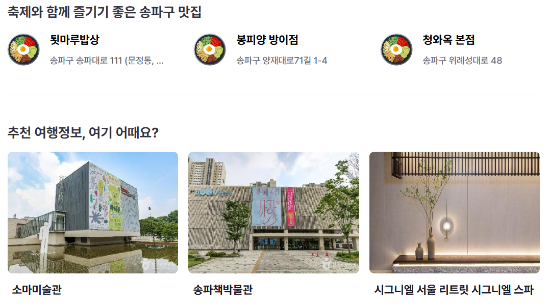 축제를 즐기고 난 후, 그냥 돌아오기 아쉽잖아요? 송파구에는 맛집과 볼거리도 정말 많아요. 든든한 한정식이 생각난다면 '툇마루밥상'이나 '청와옥'이 좋고, 시원한 평양냉면이 당긴다면 '봉피양'을 추천합니다. 축제장 바로 옆 올림픽공원에서 산책을 즐기거나, 독특한 책들이 가득한 '서울책보고'에 들러보는 것도 좋은 코스가 될 거예요.