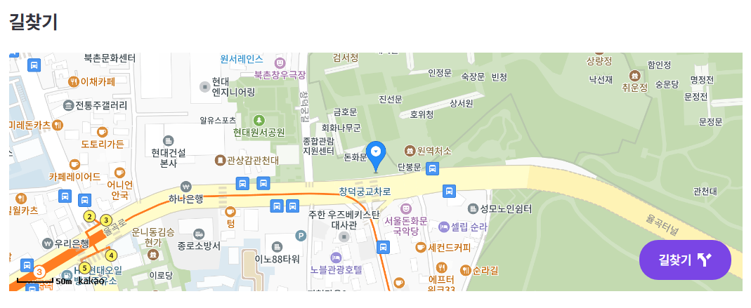 창덕궁은 대중교통으로도 쉽게 찾아갈 수 있어요. 지하철 3호선 안국역에서 하차하여 도보로 이동 가능합니다. "창덕궁 약다방"으로 카카오맵 길찾기를 이용하면 약방까지의 경로도 쉽게 확인할 수 있다고 하니 참고하세요! (카카오맵 정보에 따르면 50m라고 되어있는데, 아마 특정 지점에서 약방까지의 거리를 의미하는 것 같아요.)